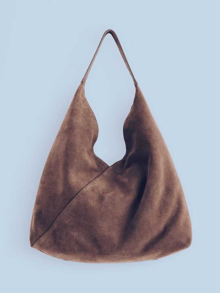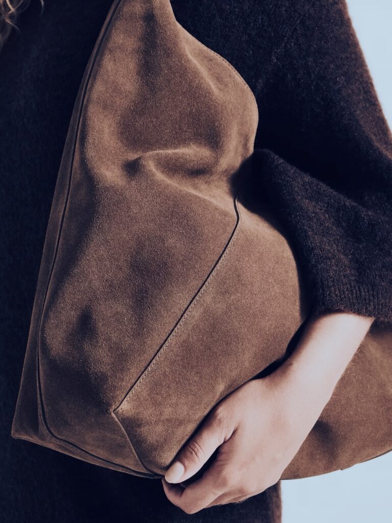 Large shopper in suede Chic & creamy, with serene form that tells just enough of its architecture, and even works as inspiration for fashionable autumn walks, while keeping a high standard of comfort. For shopping, of course.