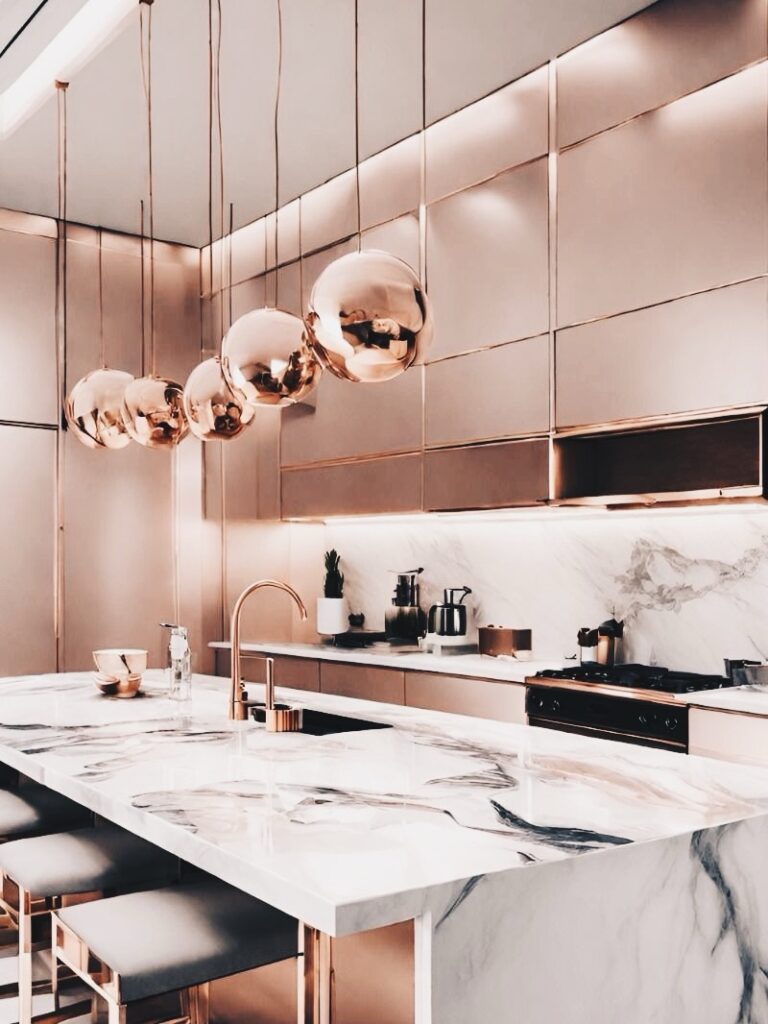 4. More interesting than classical stainless steel, rose gold plated one enlightens an interior with romantic aristocracy. It will also warm ascetic tonal palettes [like greys and whites], making interior feel more tender.